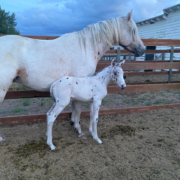 Neemeepoos Rainfire x Neemeepoos Bobcat Born April 5th. A/a, E/e, PATN1/PATN1, DMTR3/n, No LP, 5 panel negative. We are very excited about this solid filly. She comes from our proven 50 mile endurance stallion. She should be forward but sane. Her dam has had 30 days of training and has been quiet and easy going under saddle. With her double PATN genes and outstanding leopard genetics she will also be a phenomenal color producer.