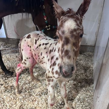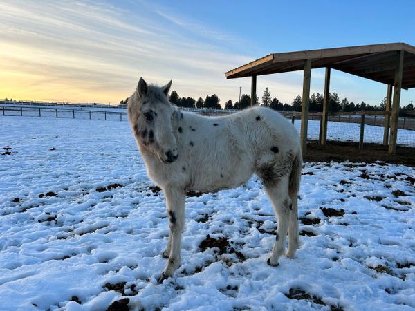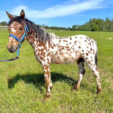 Born April 7th 2024. This filly is a bay leopard. She is a full sister to our Wishes Blue Valentine. Both parents carry endurance type genes. This filly should be fun, forward and sane. This filly is a carrier for the Indian shuffle gene. This filly went back to Montana to become part of my grandmother’s breeding program.