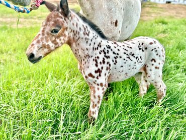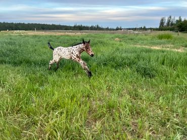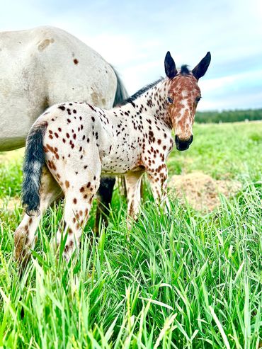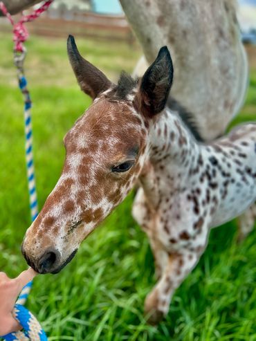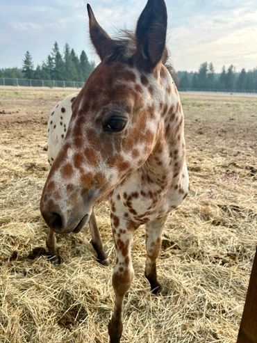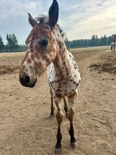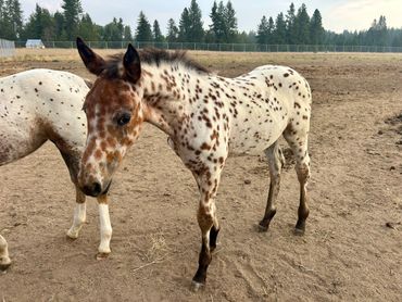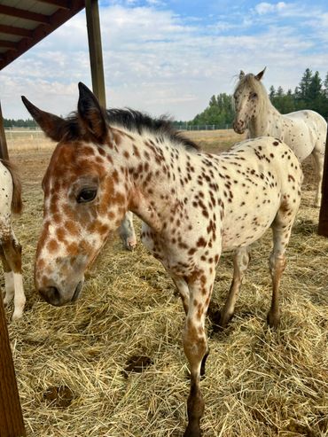 This filly is one of a kind. She is flashy and has beautiful gaits. She is very curious and friendly toward people. She is straight and correct and has good bone. She will be tall and big boned. This filly is exceptional and a barn favorite.
